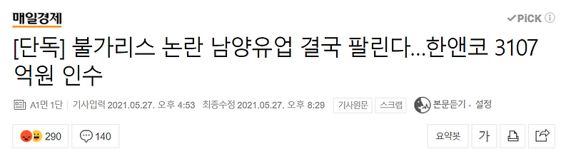 마켓인한앤컴퍼니, 대한항공 이어 아시아나 기내식 인수 검토. 한앤컴퍼니, '1조3700억' 2호 펀드 결성 완료. 이슈 남양유업 사모펀드 한앤컴퍼니 3107억원에 팔려 유키l lv.83 | 조회:781 | 20:11 8. 남양유업 인수한 한앤컴퍼니 소비자 신뢰 회복 주력할 것. 유머 빨라야 할땐 빠른 생물 공감막타누름 lv.45 | 조회:2997 | 20:00 5.